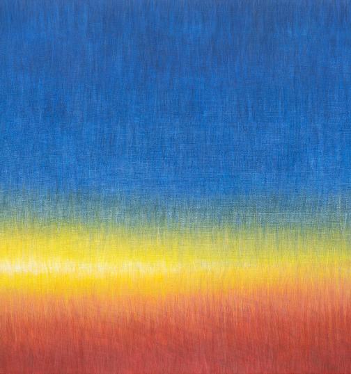 <M> 연작에서 작가의 시선은 산 너머의 하늘이라는 공간으로 확장됩니다. 하늘, 구름, 일출, 일몰 등 고정불가능한 자연의 상태가 캔버스에 포착됩니다. 하늘의 경계 없는 무한에 가까운 공간은 인간의 어떤 욕망이나 영적 숭고함을 담보하는 장소이며, 구름은 기의와 기표, 실체와 기호 사이에서 표류하는 혼돈의 대상이자 신비와 무한에 대한 표현입니다. 실체가 없지만 우리 눈앞에 분명히 펼쳐지는 이 흐릿한 풍경들은 정주영 작가 특유의 회화적인 동시에 선묘적인 필법으로 드러납니다. 계속 형태를 바꾸는 추상적이고 기하학적인 형태를 띠는 하늘의 풍경들은 수많은 색의 레이어가 쌓인 다채롭고 몽환적인 색채의 그라데이션으로 재현됩니다. <M> 연작은 감정과 기분, 행복과 슬픔, 생과 사 등 고정될 수 없고 영원히 순환할 수밖에 없는 인간의 삶과 대자연을 은유하며 감상자 내면의 상상력을 자극합니다.