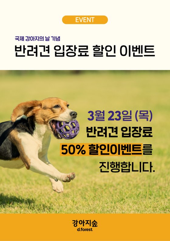 국내 최대 규모의 반려견 테마파크 강아지숲이 국제 강아지의 날을 맞아 특별한 이벤트를 진행합니다. 23일 강아지숲을 방문하는 모든 반려견은 기존 입장료에서 50% 할인된 가격으로 입장할 수 있습니다. 입장료 할인 및 보호소 강아지들이 강아지숲에서 즐거운 시간을 보낼 수 있는 초청 이벤트도 진행됩니다. 자세한 사항은 강아지숲 공식 홈페이지 및 인스타그램을 통해 확인할 수 있습니다.