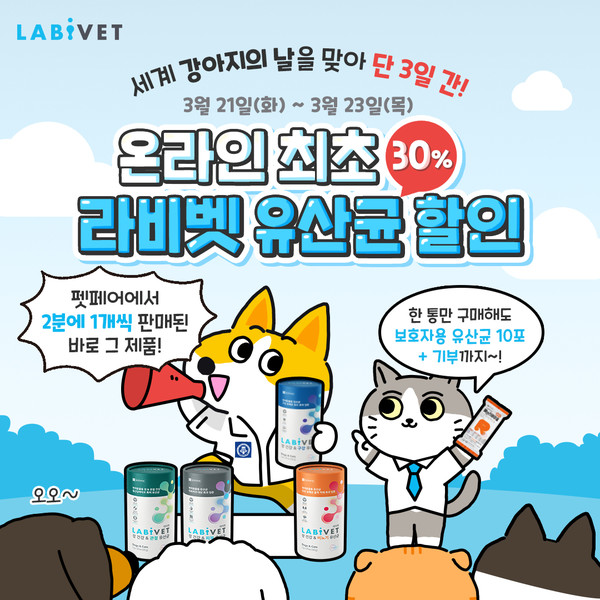 종근당바이오의 반려동물 유산균 브랜드 '라비벳'이 국제강아지의 날을 맞아 21일부터 3일간 유산균 전 품목 30%할인 행사를 진행합니다.