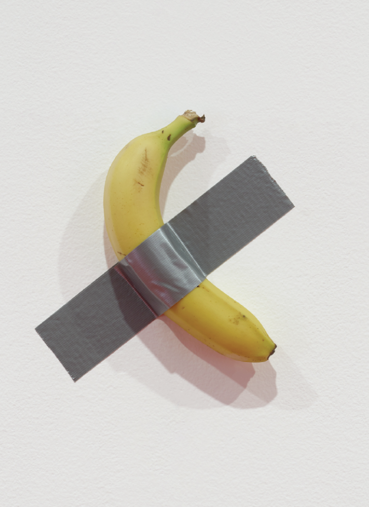 마우리치오 카텔란은 1960년 이탈리아 파도바 출생으로 가난한 집에서 태어났습니다. 트럭 운전사였던 아버지와 청소부였던 어머니 사이에서 태어난 카텔란은 학생 때부터 아르바이트를 했습니다. 요리사, 정원사, 간호사, 시체닦이 등의 직업에 종사하던 마우리치오 카텔란은 결국 예술가가 되었는데 전통 미술학교 교육은 받지 못했습니다. 어느 날 '예술가'라는 직업이 갖고 싶었던 그는 독학으로 미술을 공부했습니다. 전통적인 미술교육을 받지 않았기 때문에 카텔란의 작품세계는 오히려 자유분방하고 선입견이 없이 파격적인 작품을 선보였습니다. <코미디언>이란 작품인 벽에 테이프로 붙인 바나나는 2019년 당시 아트페어에서 12만 달러에 팔렸습니다. 그는 이를 통해 무엇이 작품이고 작품이 아닌지, 열광하는 관객들은 작품의 가치를 제대로 평가할 수 있는지 오히려 묻고 있습니다.