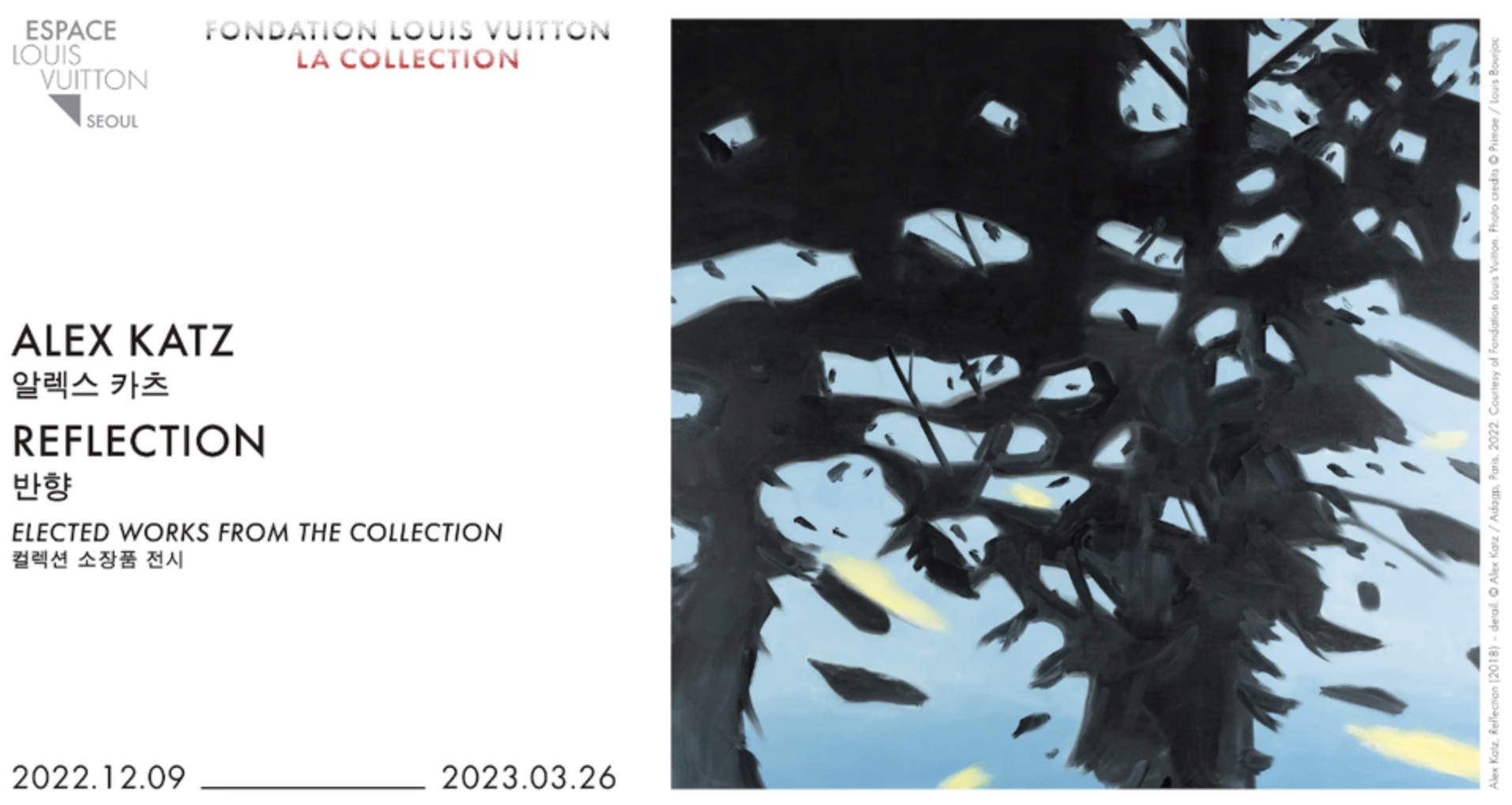 2022년 12월 9일부터 2023년 3월 26일까지, 에스파스 루이 비통 서울(Espace Louise Vuitton Seoul)은 게르하르트 리히터(Gerhard Richter)와 앤디 워홀(Andy Warhol)에 헌정한 전시에 이어 알렉스 카츠(Alex Katz)의 <반향(Reflection)> 전시를 공개합니다.