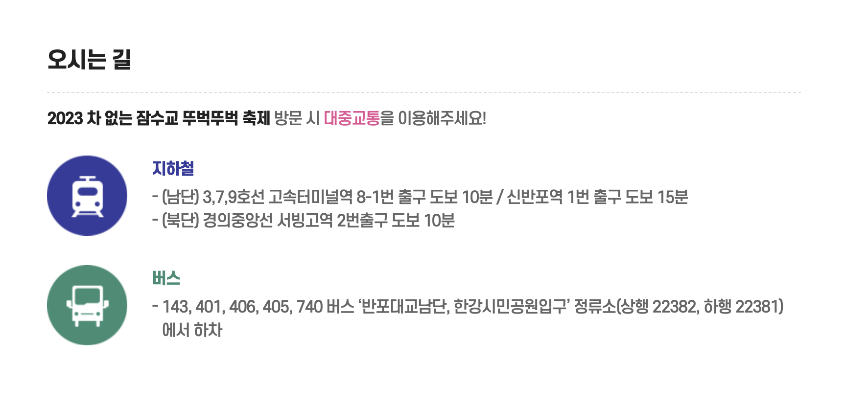 - 행사 당일 10시~23시 잠수교 북단부터 남단 달빛광장(1.1km) 교통통제가 이루어집니다.