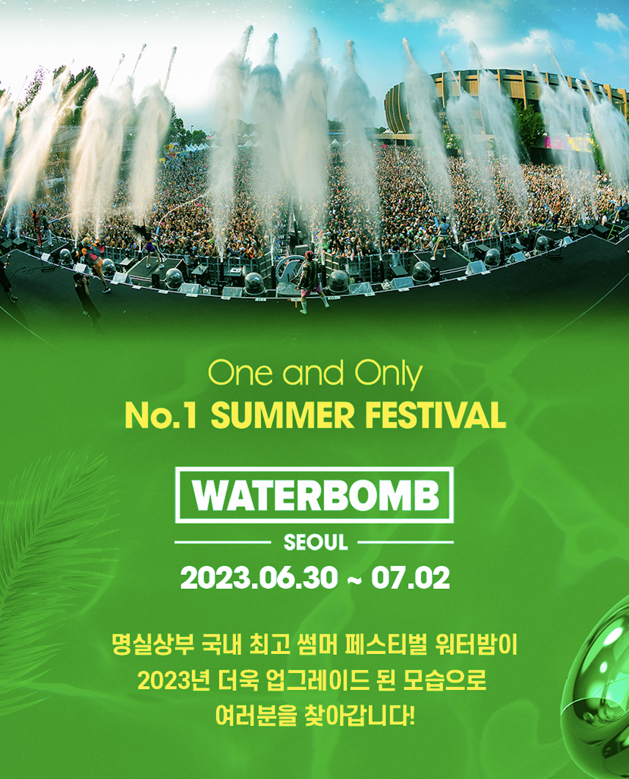 폭발적인 관심의 워터밤이 돌아왔습니다. 여름 하면 워터밤. 매년 흥행을 이루는 워터 파이팅을 메인으로 한 대결구도 컨셉의 페스티벌이죠. 큰 규모의 무대와 핫한 아티스트 라인업, 물대포 등 여름을 시원하게 즐길 수 있는 페스티벌이에요.